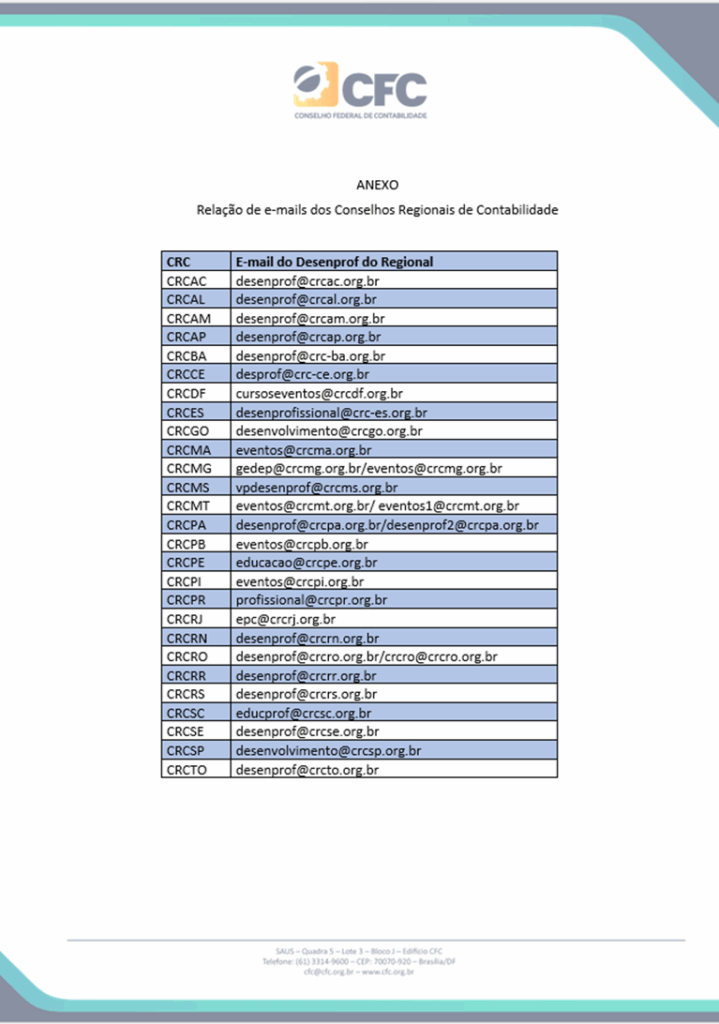 Segue abaixo a relação de e-mails dos Conselhos Regionais de Contabilidade.