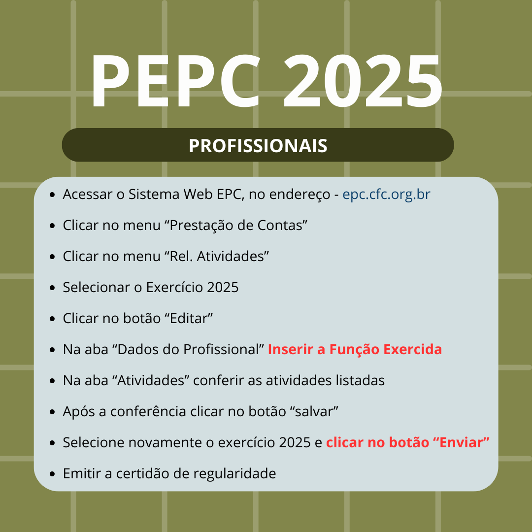 Ressaltamos que a informação deverá ser realizada por meio do Sistema Web EPC. Segue endereço de acesso - epc.cfc.org.br