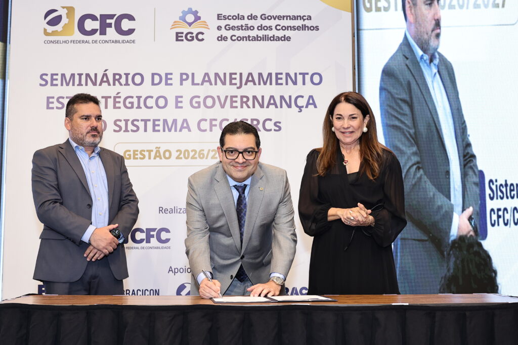 A assinatura do Convênio de Cooperação entre as entidades ocorreu durante o Seminário de Planejamento Estratégico e Governança do Sistema CFC/CRCs, na manhã da terça-feira (9). Participaram da cerimônia o presidente do CFC, Joaquim Bezerra; a diretora de Administração e Finanças do Sebrae Nacional, Margarete Coelho; e o presidente da Fenacon, Daniel Coêlho.