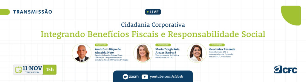 O Conselho Federal de Contabilidade (CFC) realiza, na próxima terça-feira (11), às 15h, a live Cidadania Corporativa: Integrando Benefícios Fiscais e Responsabilidade Social. O evento virtual é gratuito e será transmitido pelo canal do CFC no YouTube.