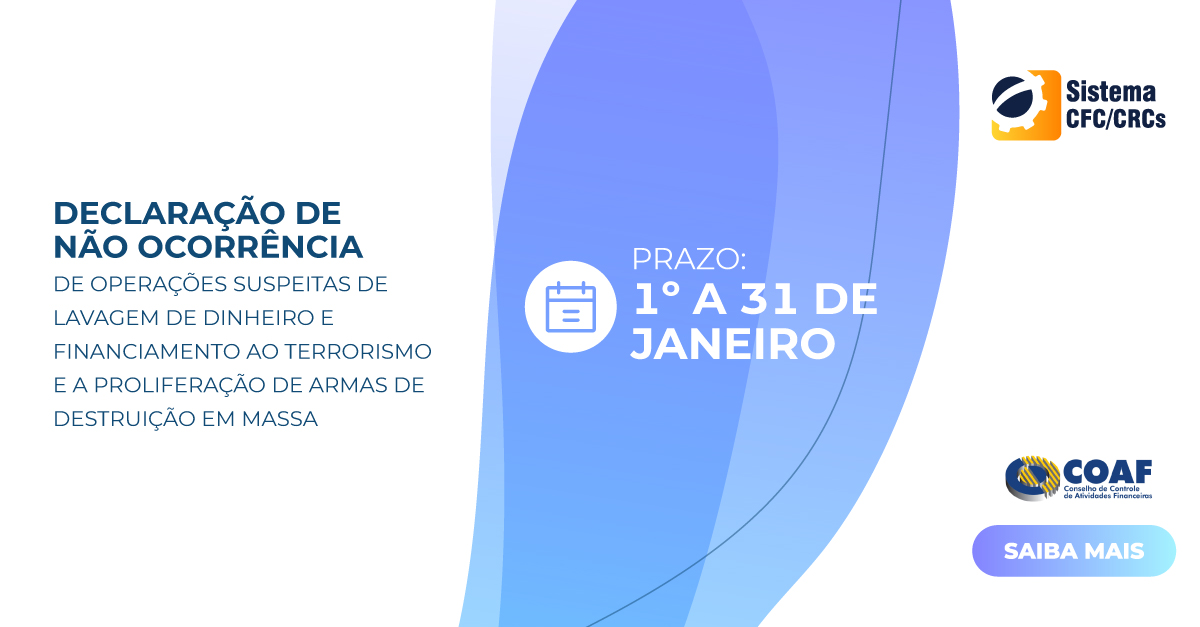 Foi dado início ao período de envio da Declaração de Não Ocorrência de Operações Suspeitas ao Coaf e ao Conselho Federal de Contabilidade (CFC), que vai de 1º a 31 de janeiro de 2026.