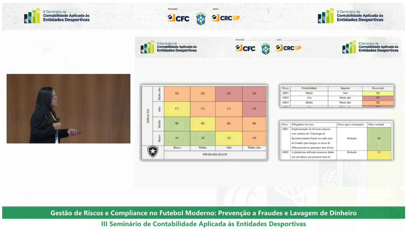 Em seguida, a palestrante apresentou ao público um histórico da SAF Botafogo. Andressa Fellipe também explicou quais são os riscos aos quais os clubes estão expostos e como reduzi-los. A palestrante ainda compartilhou o que há de novo no aspecto regulatório que pode gerar impactos financeiros nos clubes e que deve receber ainda mais a atenção dos profissionais da contabilidade. Entre as inovações mencionadas estavam a governança corporativa da Lei das SAFs, a biometria facial nos estádios, o “fair play financeiro” e as apostas esportivas. As regulações estaduais também foram citadas como elementos que podem trazer impactos financeiros.