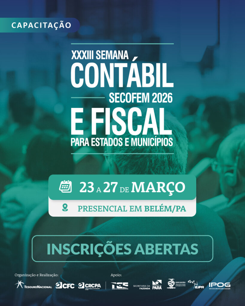 Os interessados em participar XXXIII Semana Contábil e Fiscal para Estados e Municípios (Secofem) tem até o dia 27 de fevereiro para fazer a inscrição. O evento é gratuito e acontece de 23 a 27 de março de 2026, em Belém/PA. As inscrições devem ser realizadas por meio do Sistema de Eventos do Conselho Federal de Contabilidade (CFC). A iniciativa é organizada e realizada pelo CFC, pelo Conselho Regional de Contabilidade do Pará (CRCPA) e pela Secretaria do Tesouro Nacional (STN).